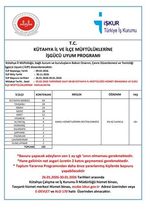 İlçe Müftülüğümüze (İUP) İşgücü Uyum Programı kapsamında 2 kişilik katılımcı alımı yapacaktır