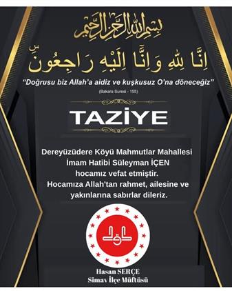 Dereyüzüdere Köyü Mahmutlar Mahallesi İmam Hatibi Süleyman İÇEN hocamız vefat etmiştir.