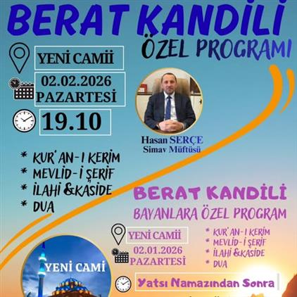 Merkez Yeni Camiide Düzenlenecek Olan Berat Kandili Özel Programına Tüm Halkımız Davetlidir