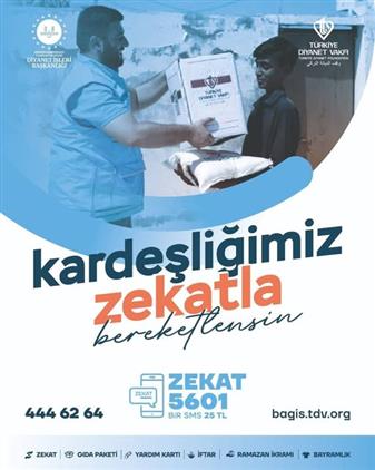 Zekatlarınızı Türkiye Diyanet Vakfı aracılığı ile ihtiyaç sahiplerine bağışlamak için tüm operatörlerden ZEKAT yazıp 5601' e sms göndererek her sms'te 25 TL olmak üzere ulaştırabilirsiniz.